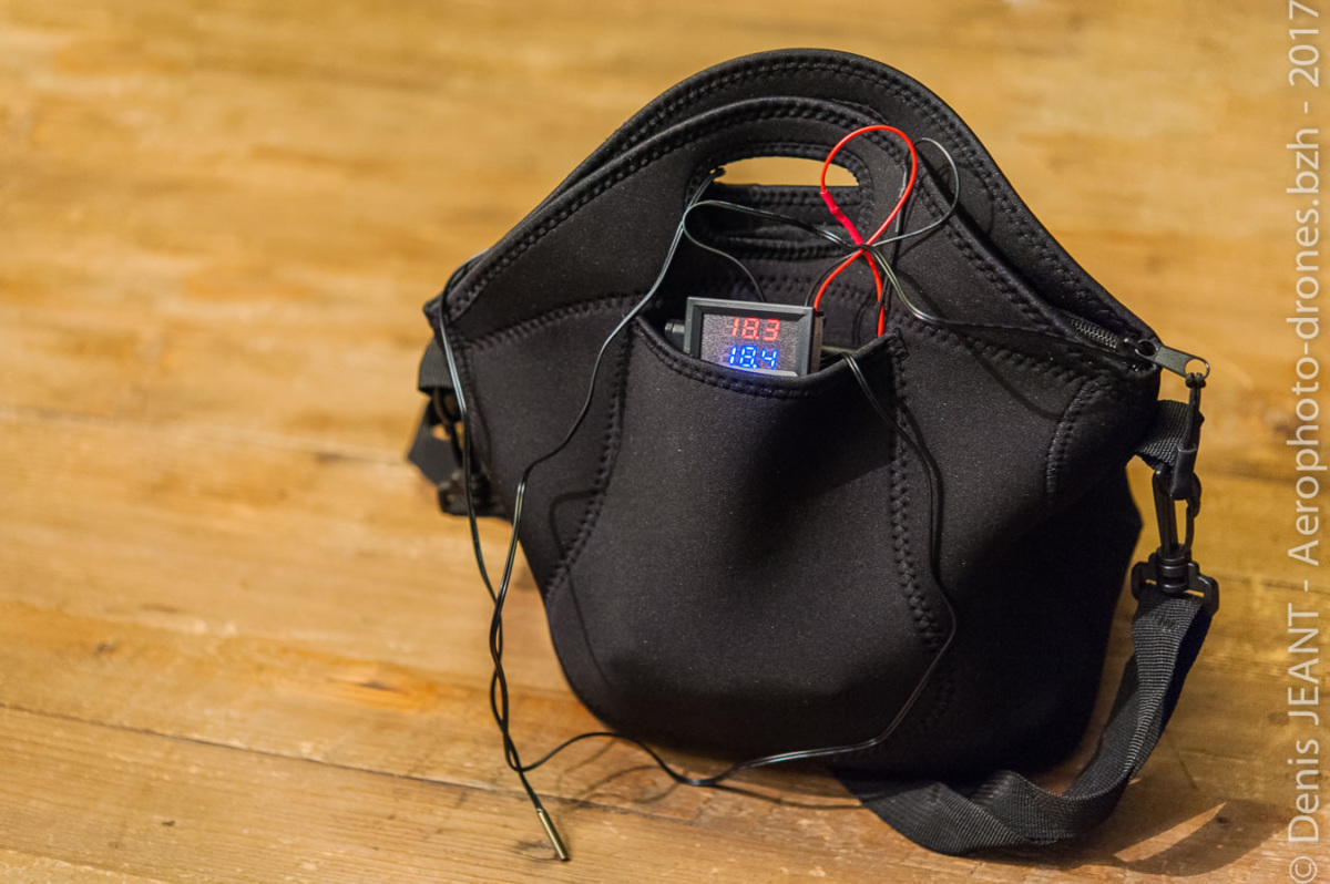 Dans un premier temps, j'ai donc réalisé un cahier des charges adapté à l'utilisation des drones avec des basses températures. Dans un second temps, j'ai sélectionné deux prototypes de sacs chauffe-batteries que j'ai détourné de leur utilisation première. J'ai réalisé deux tests en situation réelles, sur le terrain, avec un thermomètre à deux sondes autonome. Les résultats en détails et mon premier retour d'expérience que j'ai publié en ligne sont plutôt encourageants. C'est un sac chauffe-batteries que j'utilise depuis quand je vole en drone avec des températures extérieures en dessous de 18°C. Pour plus d'informations sur ce projet et les tests en situation, je vous invite à lire l'article: "Sac chauffe-batteries pour drones en hiver"