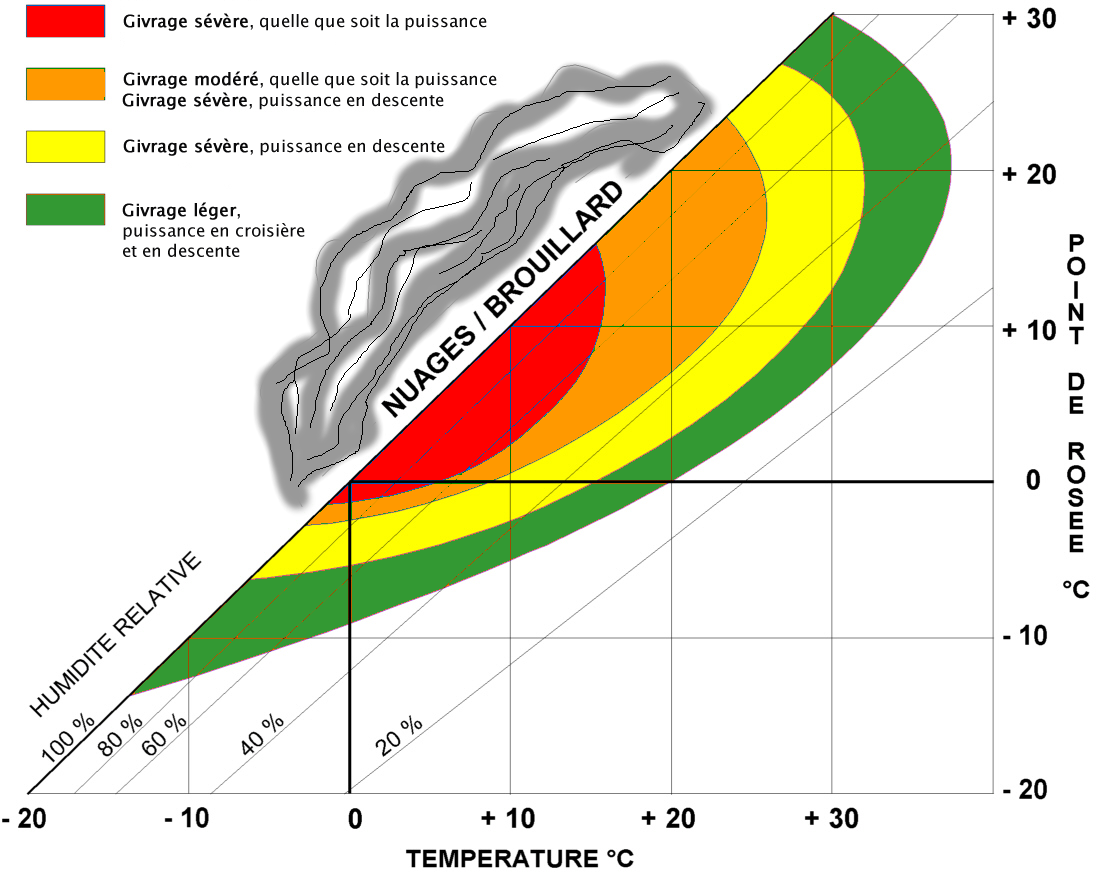 Risque de givrage du carburateur d'un avion en fonction de la température et de l'humidité relative ou du point de rosée.